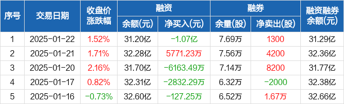 融资方面,当日融资买入3.46亿元,融资偿还4.53亿元,融资净偿还1.07亿元,净偿还额两市排名第15。融券方面,融券卖出1.82万股,融券偿还1.69万股,融券余量7.69万股,融券余额832.6万元。融资融券余额合计31.29亿元。