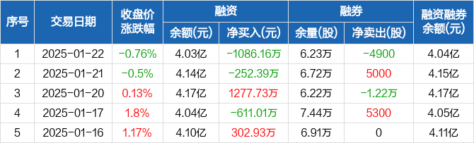 融资方面,当日融资买入899.24万元,融资偿还1985.41万元,融资净偿还1086.16万元。融券方面,融券卖出0股,融券偿还4900股,融券余量6.23万股,融券余额48.84万元。融资融券余额合计4.04亿元。