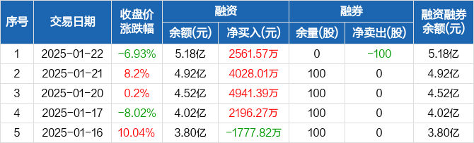 融资方面,当日融资买入1.74亿元,融资偿还1.48亿元,融资净买入2561.57万元,连续4日净买入累计1.37亿元。融券方面,融券卖出0股,融券偿还100股,融券余量0股,融券余额0元。融资融券余额合计5.18亿元。
