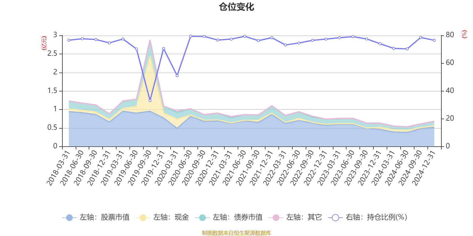 据定期报告数据统计,近三年平均股票仓位为75.52%,同类平均为79.9%。2020年上半年末基金达到79.39%的最高仓位,2019年三季度末最低,为33.07%。