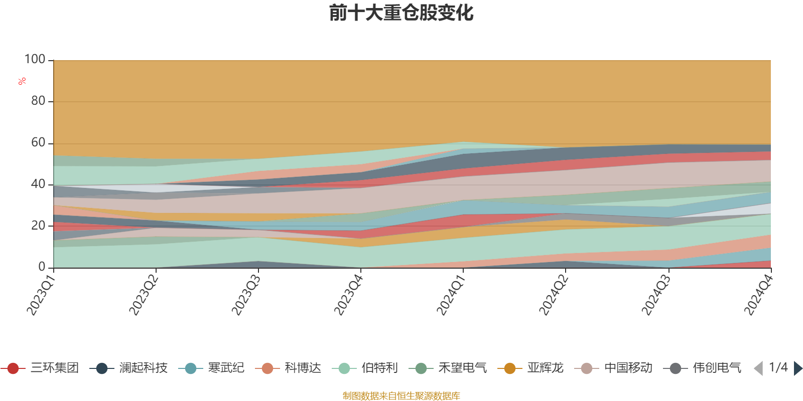 该基金持股集中度较高。截至2024年四季度末,基金十大重仓股分别是龙芯中科、伯特利、科博达、寒武纪、宁德时代、恒立液压、立讯精密、东方电缆、三环集团、英维克。