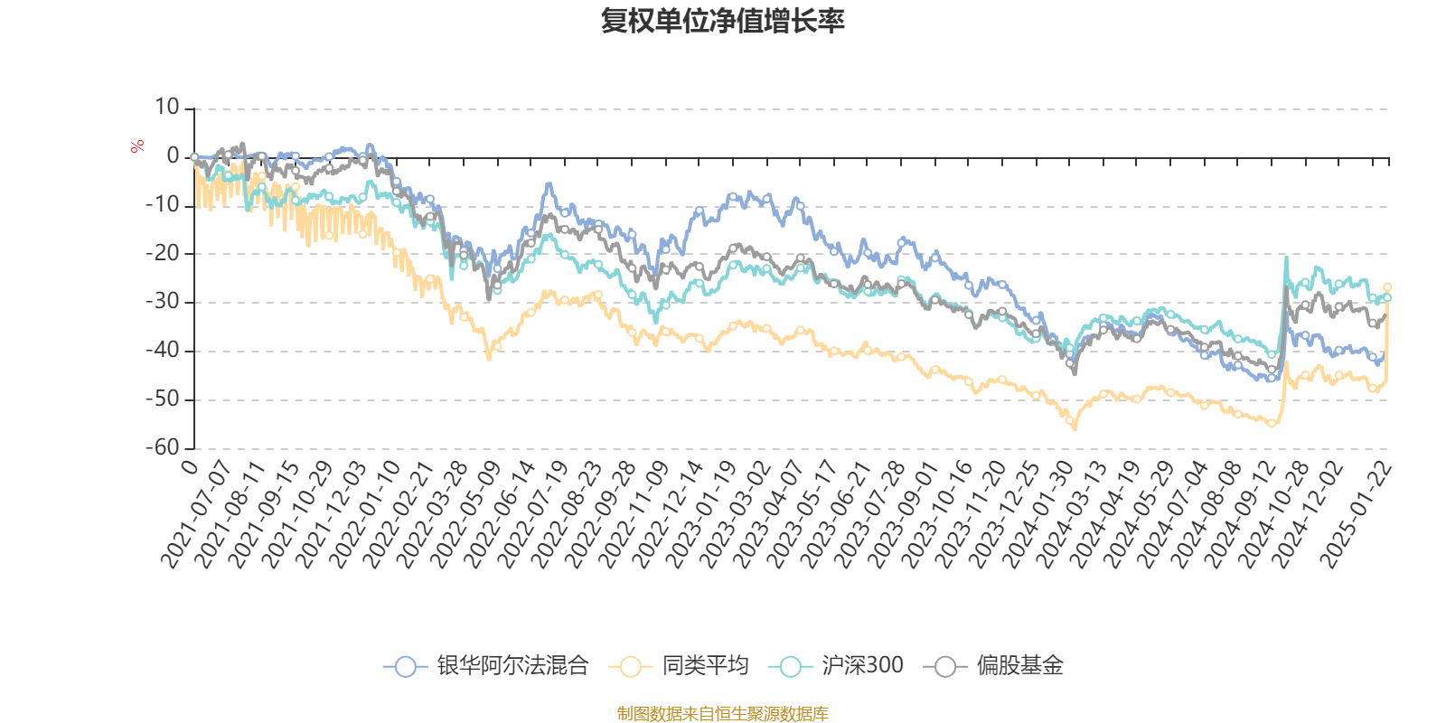 截至1月21日,银华阿尔法混合近三个月复权单位净值增长率为-5.31%,位于同类可比基金223/256;近半年复权单位净值增长率为-0.70%,位于同类可比基金230/256;近一年复权单位净值增长率为-2.75%,位于同类可比基金244/256;近三年复权单位净值增长率为-36.04%,位于同类可比基金192/232。