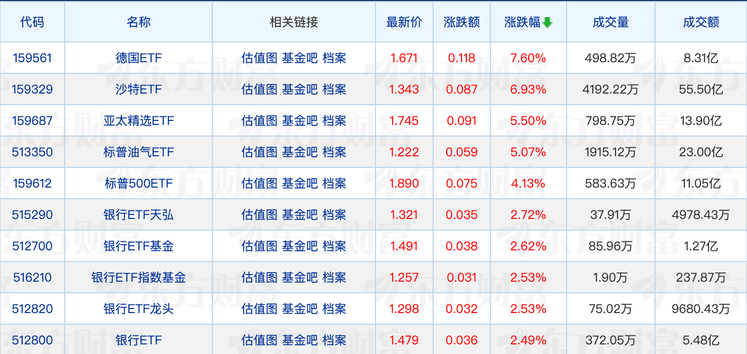 具体来看,德国ETF领涨7.60%;此外,大金融股表现活跃,保险、银行领涨,银行ETF集体走强。