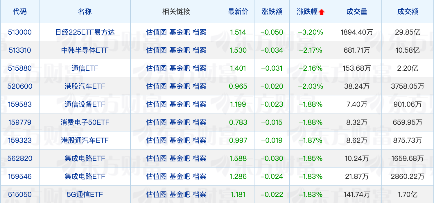 下跌方面,中韩半导体ETF领跌,多只通信相关ETF回调居前。
