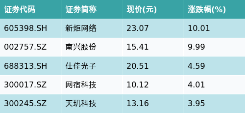 截至收盘,数据中心主题涨跌幅最高的五只股票为:新炬网络(605398.SH)、南兴股份(002757.SZ)、仕佳光子(688313.SH)、网宿科技(300017.SZ)与天玑科技(300245.SZ)。详情见下表: