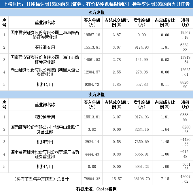 今日龙虎榜单上出现了深股通的身影,占据了买二、卖一的位置,净买入6338.88万元,占当日成交总额的1.25%。