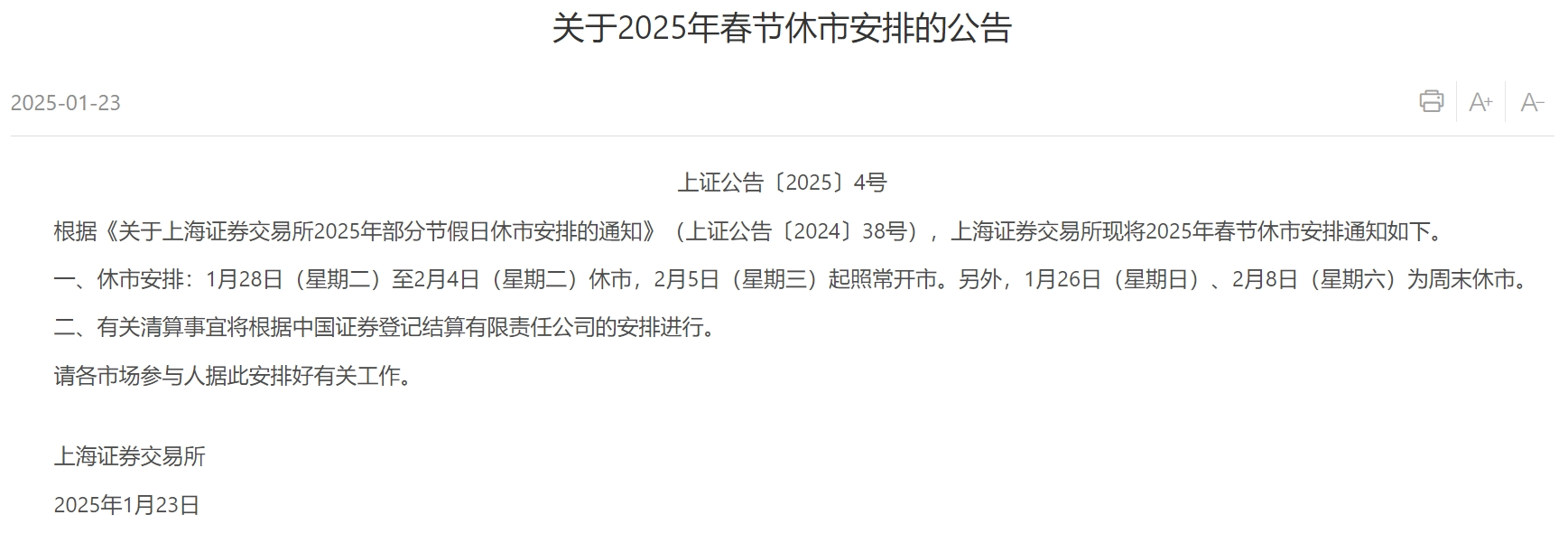 根据《关于上海证券交易所2025年部分节假日休市安排的通知》(上证公告〔2024〕38号),上海证券交易所现将2025年春节休市安排通知如下。