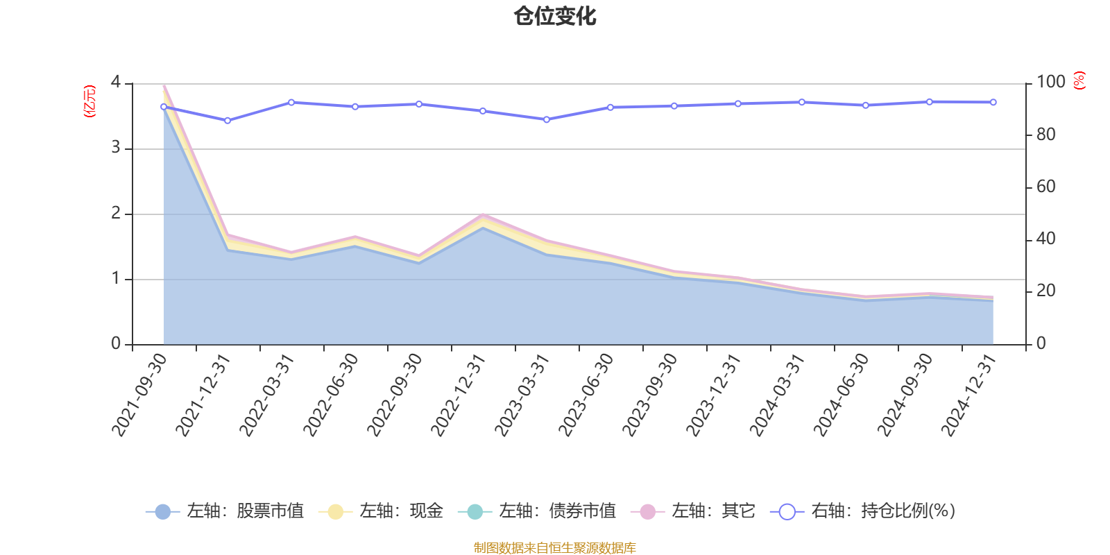 据定期报告数据统计,近三年平均股票仓位为91.29%,同类平均为88.09%。2024年三季度末基金达到92.87%的最高仓位,2021年末最低,为85.71%。
