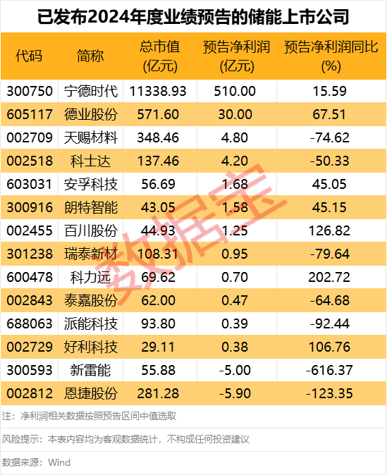 据证券时报·数据宝统计,截至目前,储能板块已有14股发布2024年度业绩预告。