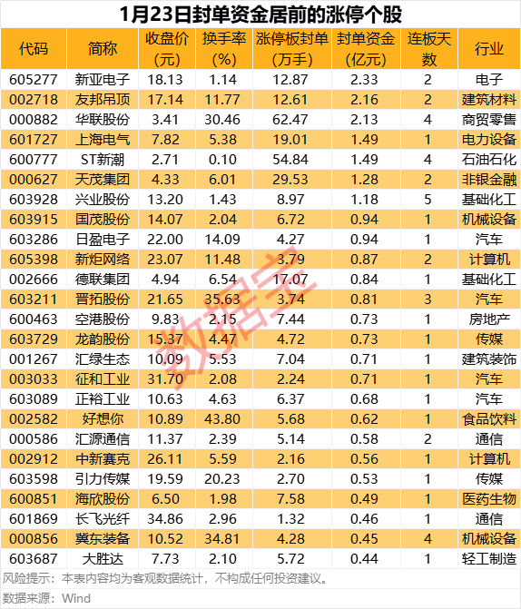 涨停战场:新亚电子封单资金居首