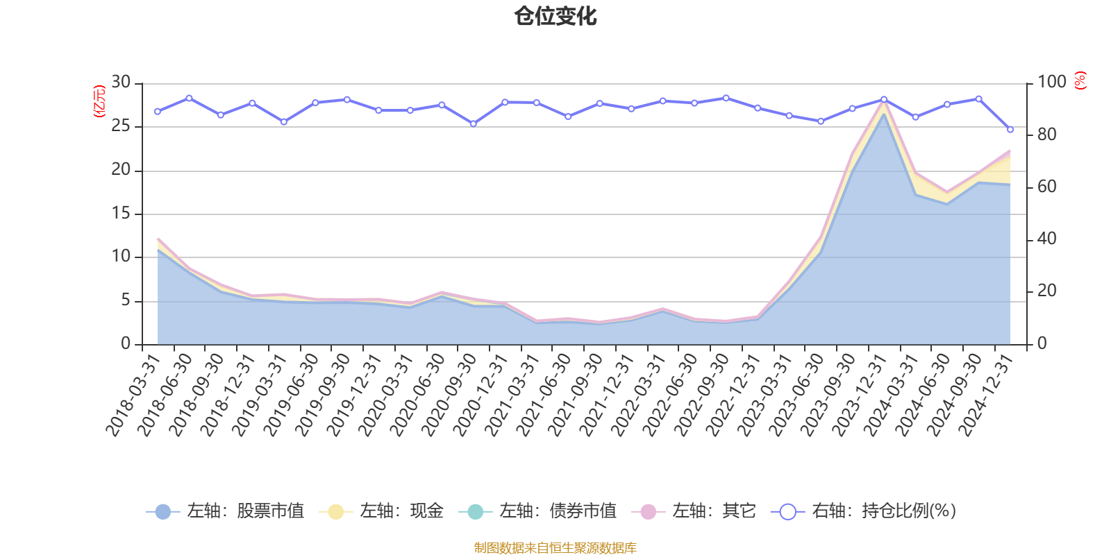 据定期报告数据统计,近三年平均股票仓位为90.25%,同类平均为87.87%。2022年三季度末基金达到94.35%的最高仓位,2024年末最低,为82.3%。