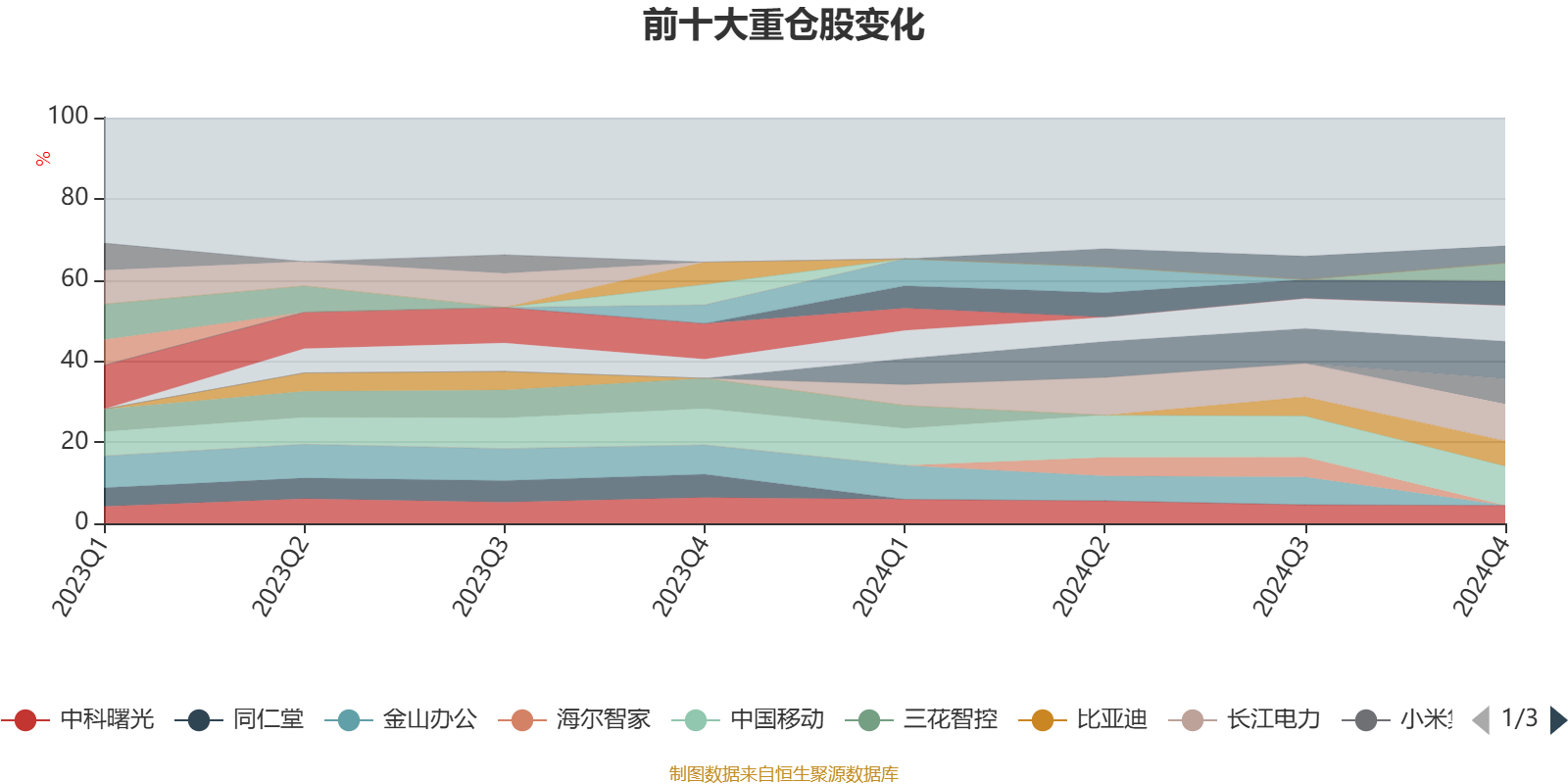 该基金持股集中度较高,近2年前十大重仓股集中度长期超过60%。截至2024年四季度末,基金十大重仓股分别是中国移动、中国电信、长江电力、小商品城、比亚迪、小米集团-W、海光信息、中科曙光、腾讯控股、歌尔股份。