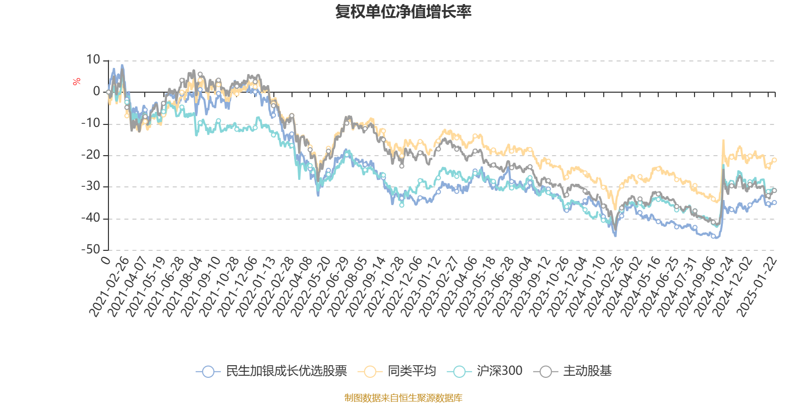 截至1月22日,民生加银成长优选股票近三个月复权单位净值增长率为2.33%,位于同类可比基金8/74;近半年复权单位净值增长率为12.29%,位于同类可比基金16/74;近一年复权单位净值增长率为13.78%,位于同类可比基金47/74;近三年复权单位净值增长率为-30.88%,位于同类可比基金58/73。