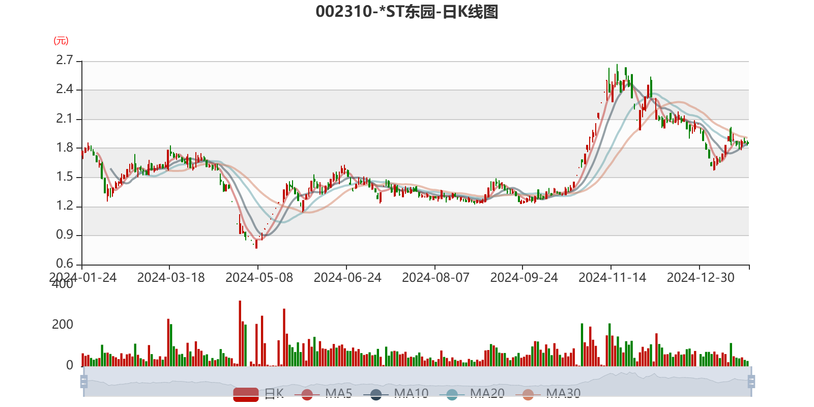 中证智能财讯 *ST东园(002310)1月23日晚间披露2024年度业绩预告,预计2024年实现营业收入6.9亿元至9亿元;归母净利润亏损31.3亿元至37.6亿元,上年同期亏损50.83亿元;扣非净利润亏损49.5亿元至61.9亿元,上年同期亏损50.67亿元;基本每股收益-0.52元/股至-0.63元/股。以1月23日收盘价计算,*ST东园目前市盈率(TTM)约为-2.95倍至-3.55倍,市净率(LF)约-4.49倍,市销率(TTM)约13.96倍。