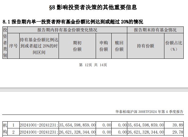 根据华泰柏瑞沪深300ETF四季报,报告期内单一投资者持有基金份额比例达到或超过20%的有机构1和机构2,二者在报告期末分别持有356.55亿份和266.21亿份。
