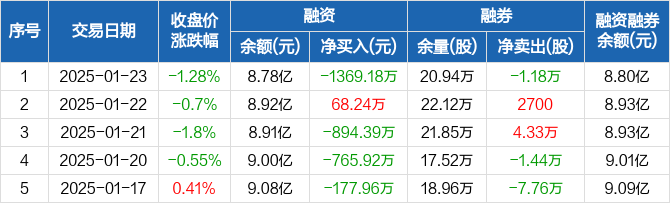 融资方面,当日融资买入1006.85万元,融资偿还2376.03万元,融资净偿还1369.18万元。融券方面,融券卖出1.68万股,融券偿还2.86万股,融券余量20.94万股,融券余额145.74万元。融资融券余额合计8.8亿元。
