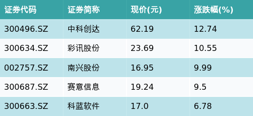 截至午间收盘,华为HMS主题涨跌幅最高的五只股票为:中科创达(300496.SZ)、彩讯股份(300634.SZ)、南兴股份(002757.SZ)、赛意信息(300687.SZ)与科蓝软件(300663.SZ)。详情见下表: