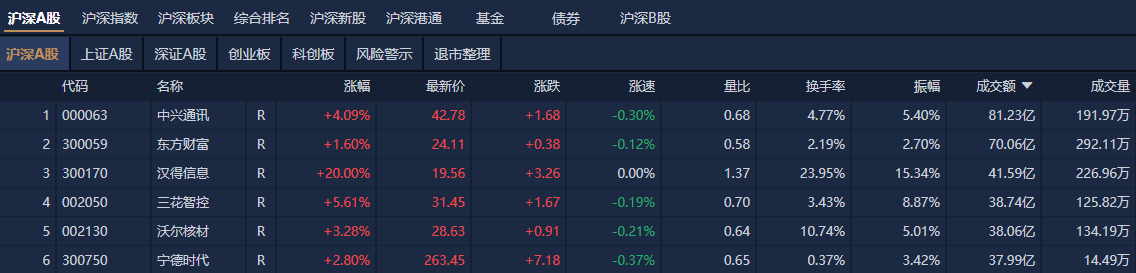 沪深两市半日成交额7372亿元,较上个交易日缩量1722亿元。个股中,中兴通讯半日成交额超81亿元居首,东方财富成交额超70亿元,汉得信息、三花智控、沃尔核材等成交额居前。