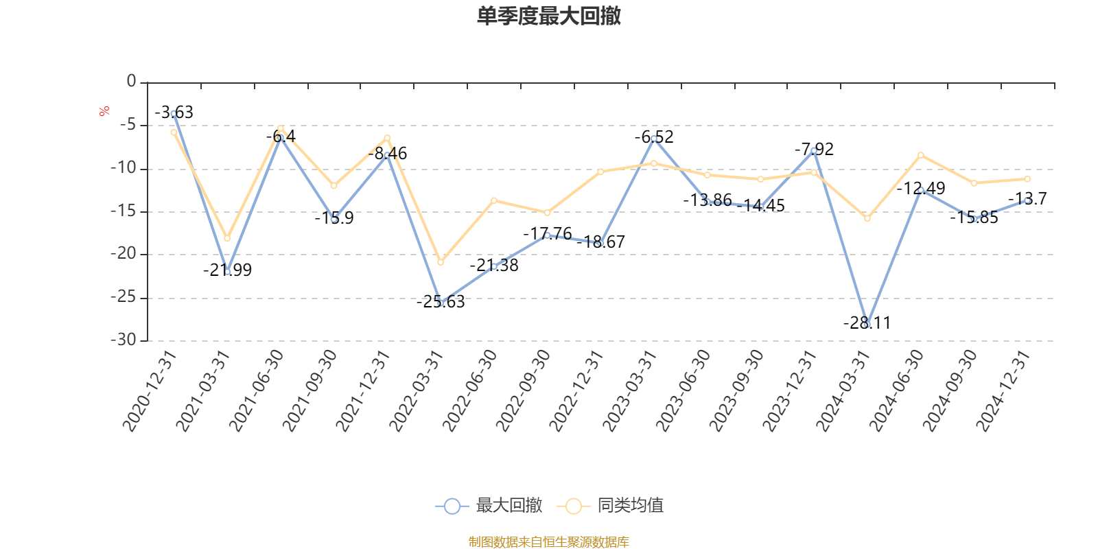 截至1月22日,基金近三年最大回撤为51.75%,同类可比基金排名27/198。单季度最大回撤出现在2024年一季度,为28.11%。