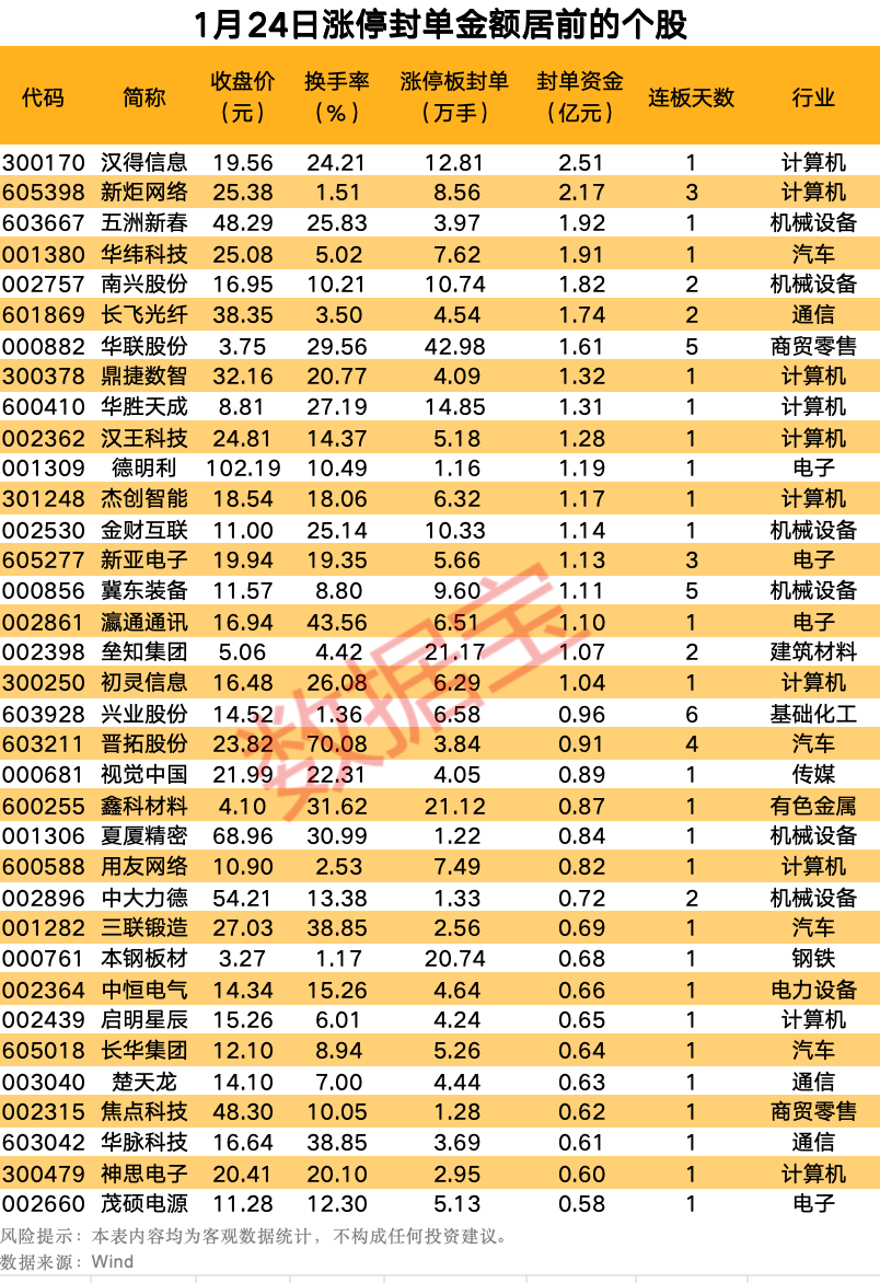 以封单金额计算,18股封单金额超亿元,汉得信息、新炬网络、五洲新春封单金额居前,分别为2.51亿元、2.17亿元、1.92亿元。