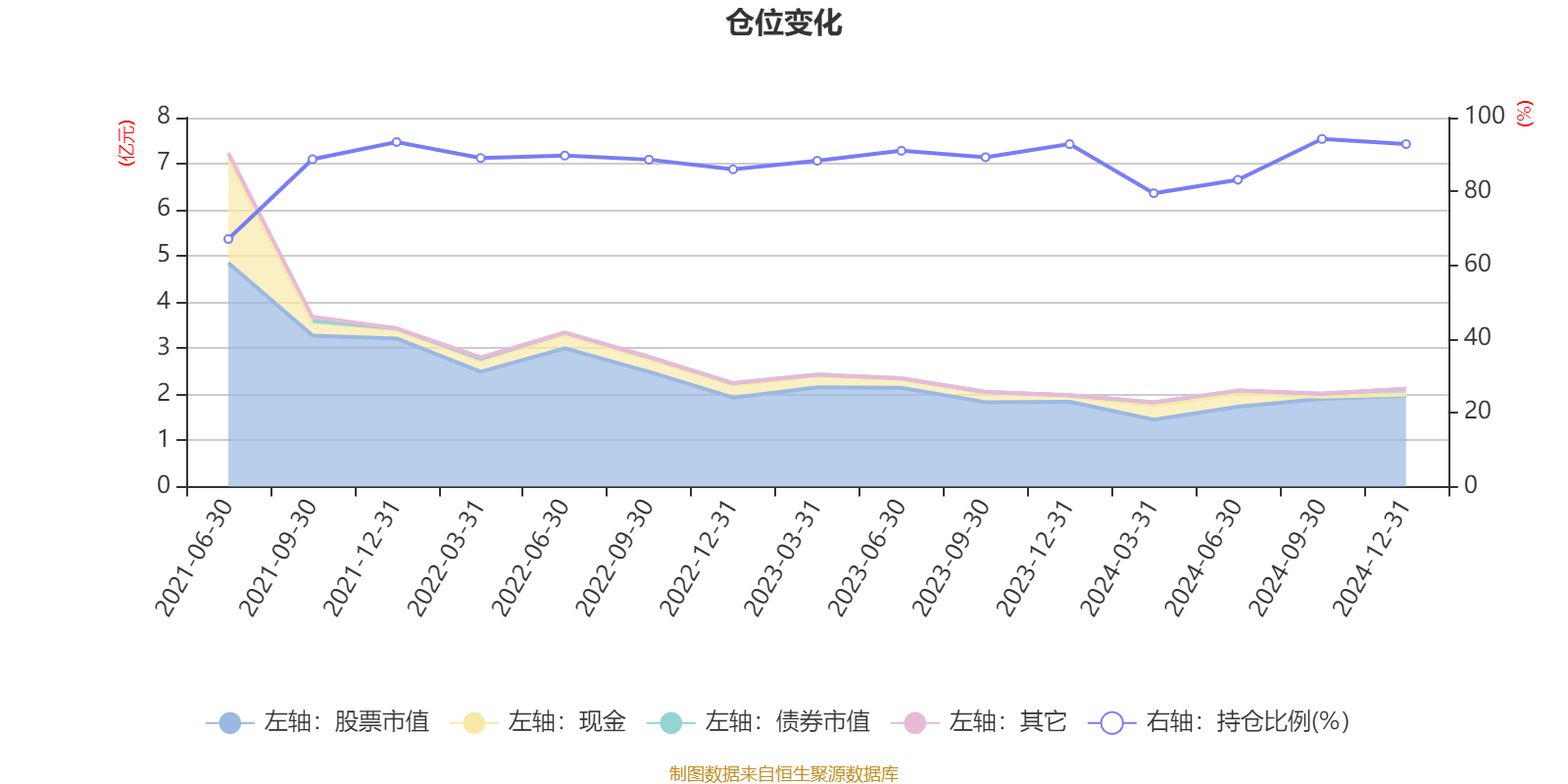 据定期报告数据统计,近三年平均股票仓位为88.7%,同类平均为84.97%。2024年三季度末基金达到94.22%的最高仓位,2021年上半年末最低,为67.08%。