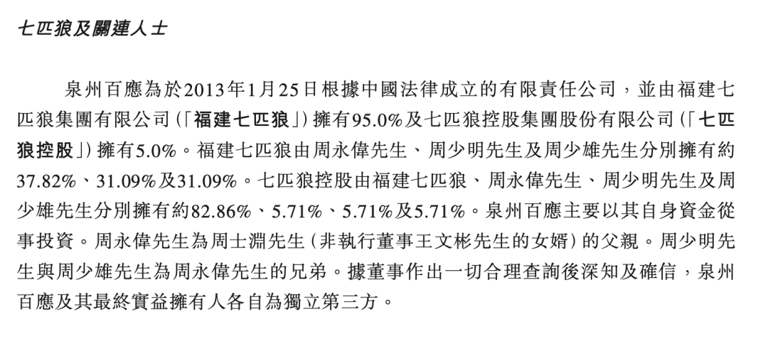 招股书显示,七匹狼控股的泉州百应公司是八马茶业此前投资者之一。从股东架构来看,福建七匹狼及其关联人士旗下的泉州百应、晋江百应成,分别持有八马茶业2.61%和1.95%的股份,是公司第四、第五大的企业股东。