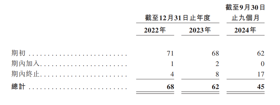 2024年前三季度,加盟店只关不开。2022-2023年年末以及2024年三季度末,乐摩合伙人分别为68个、62个以及45个,报告期内分别加入1、2以及0家,退出4、8以及17家。