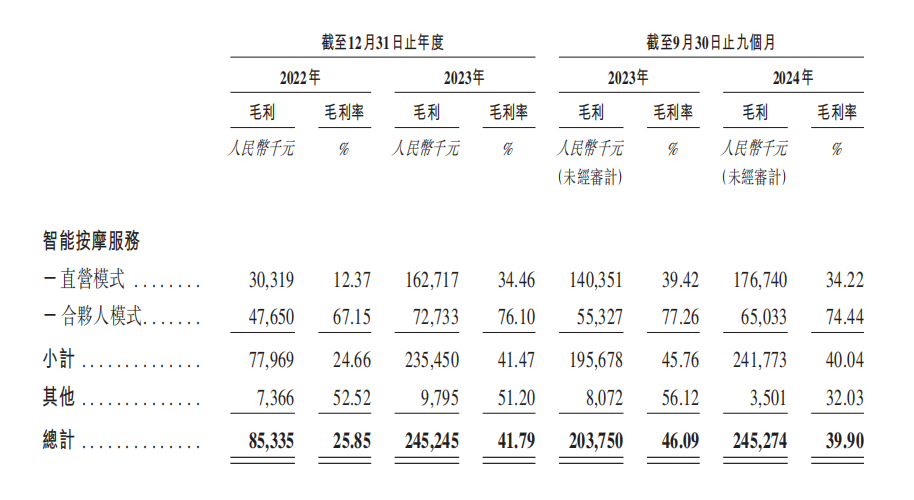 相比之下,2024年前三季度,乐摩合伙人模式下的毛利率74.4%,远高于直营模式的34.2%。这一差距意味着乐摩将很大一部分POS成本和按摩椅的折旧及摊销都转移到合伙人身上去了。
