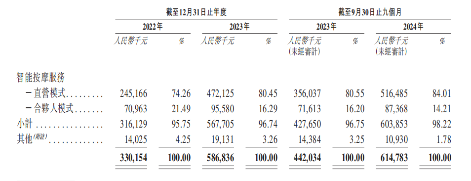 乐摩的主营业务智能按摩服务分为直营模式、合伙人模式即加盟模式,截至2024年前三季度,直营模式收入占总营收84%,合伙人模式仅占比14.2%。而按经营模式划分,乐摩点服务网点中直营模式占七成,合伙人模式占三成。