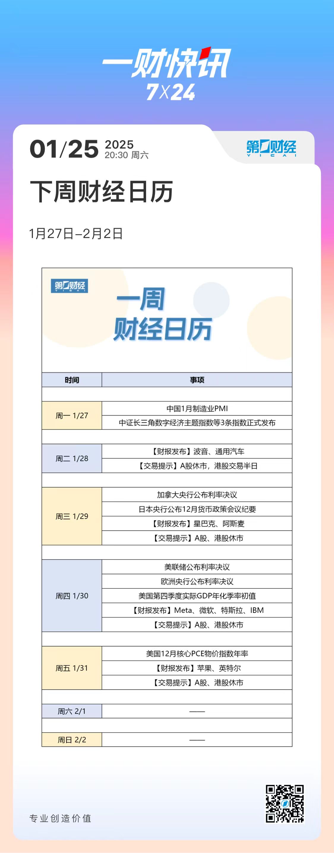 下周财经日历(1月27日-2月2日)