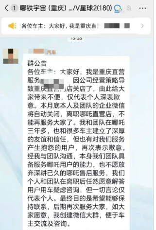 1月24日,记者查阅多个公众平台发现,关于哪吒汽车在多地关闭直营门店的消息陆续被曝出。有哪吒汽车用户晒出其收到的当地直营门店关店通知显示,当地哪吒汽车直营服务负责人称,“因公司经营策略导致当地直营门店关店,由此给大家带来不便深表歉意。团队企业微信将自动关闭,不能再服务用户”。