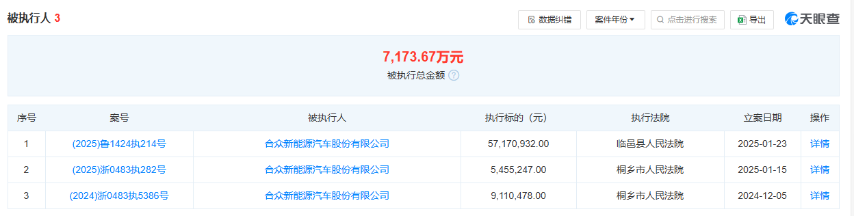 值得一提的是,在哪吒汽车进行E轮融资的同时,其股权冻结和被执行人信息也在增多。天眼查显示,进入2025年以来,哪吒汽车新增了14条股权冻结和2条被执行人信息。其中,1月23日,合众汽车新增一则执行标为5717万余元的被执行人信息,加上2025年1月15日被桐乡市人民法院强制执行的约545万元,以及2024年12月5日强制执行的约911万元,合众汽车被执行总金额已超7000万元。
