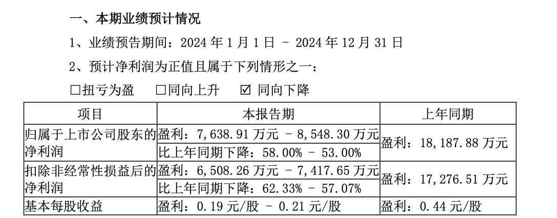 1月24日晚间,深圳汇洁集团股份有限公司(以下简称“汇洁股份”或“公司”)发布2024年度业绩预告。公司预计2024年归属于上市公司股东的净利润盈利7,638.91万元-8,548.30万元,比上年同期下降58.00%-53.00%;扣除非经常性损益后的净利润盈利6,508.26万元-7,417.65万元,比上年同期下降62.33%-57.07%;基本每股收益盈利0.19元/股-0.21元/股。