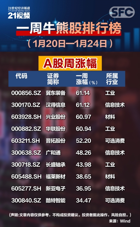 一周牛熊股(1月20日—1月24日):最牛股冀东装备5连板;最熊股川大智胜面临退市风险