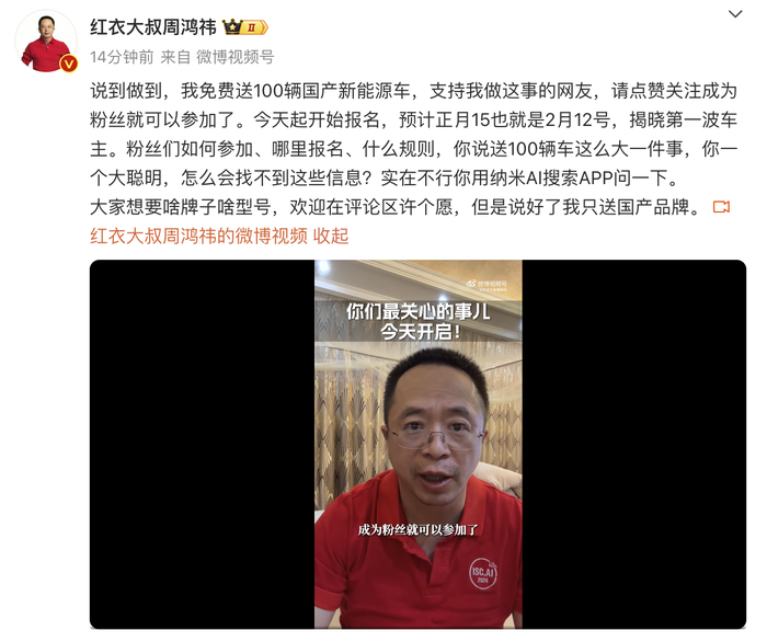 1月26日,360集团创始人、董事长周鸿祎在社交平台宣布,将免费送100辆国产新能源车,即日起开始报名,预计正月十五(2月12日)揭晓第一波车主。