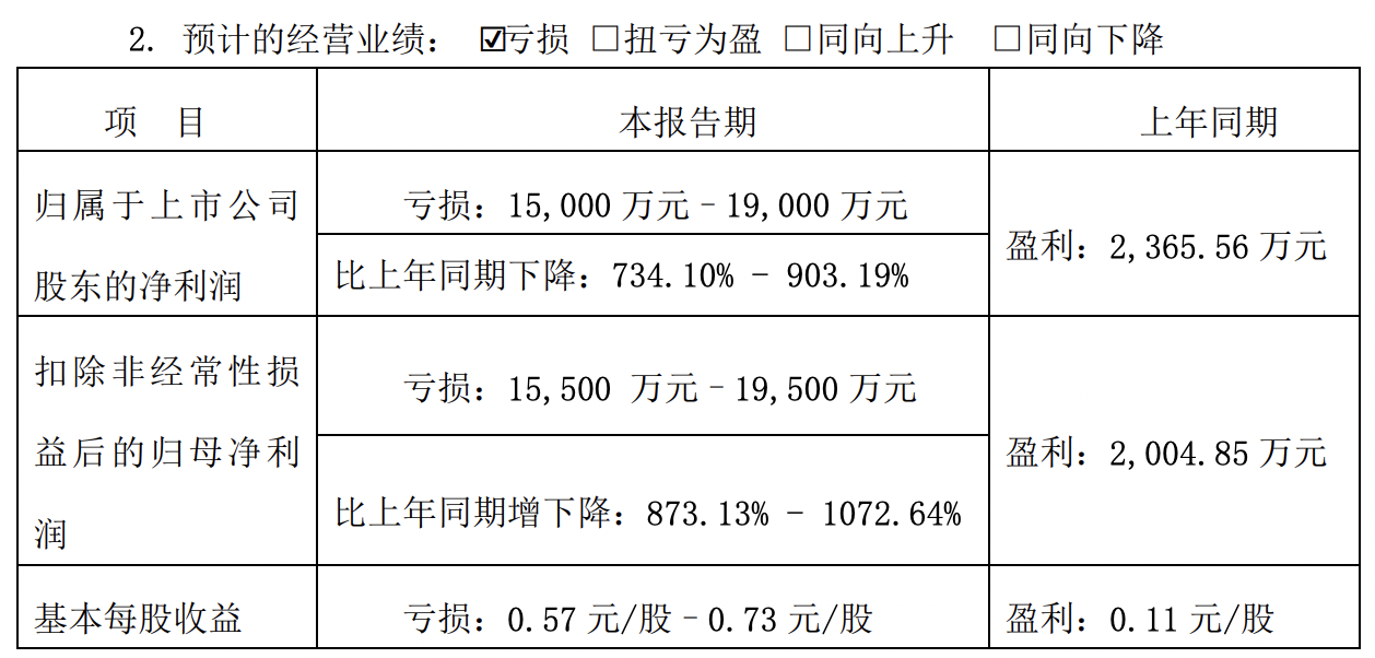 公告显示,公司预计2024年归母净利润亏损1.5亿元至1.9亿元,上年同期盈利2365.56万元;扣非净利润亏损1.55亿元至1.95亿元,上年同期盈利2004.85万元。
