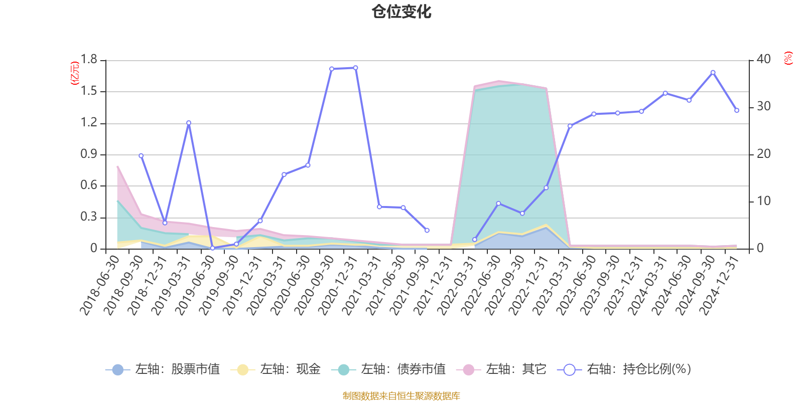 据定期报告数据统计,近三年平均股票仓位为23%,同类平均为18.74%。2020年末基金达到38.39%的最高仓位,2019年上半年末最低,为0.18%。