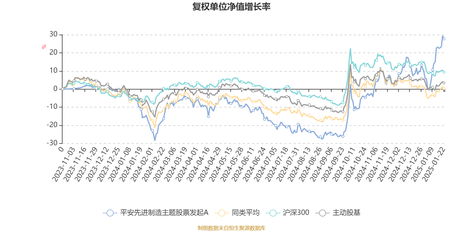 截至1月22日,平安先进制造主题股票发起A近三个月复权单位净值增长率为32.80%,位于同类可比基金1/42;近半年复权单位净值增长率为59.77%,位于同类可比基金1/42;近一年复权单位净值增长率为51.98%,位于同类可比基金1/41。