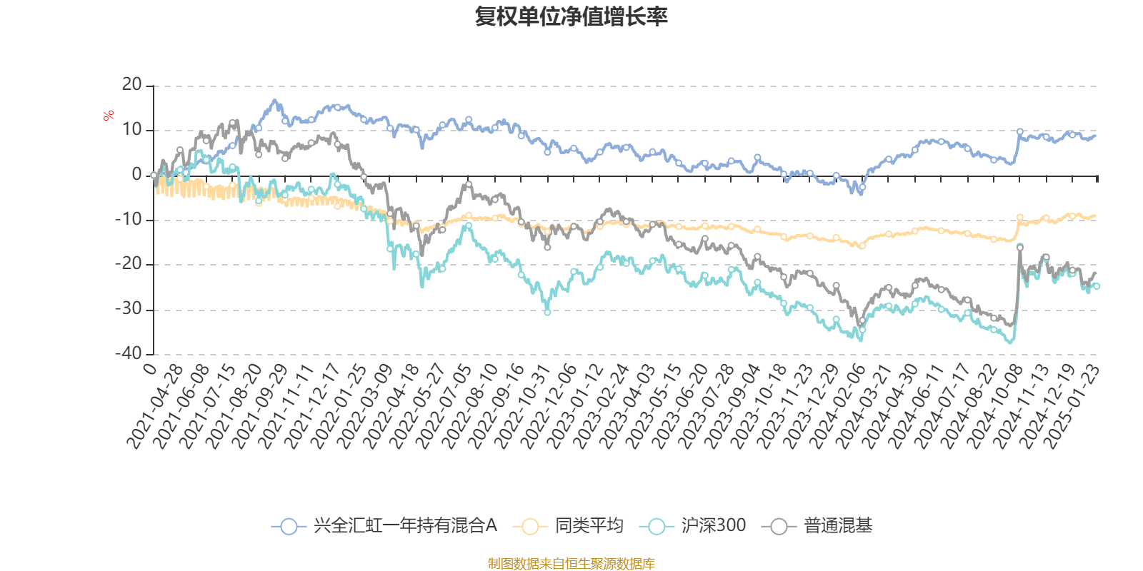 截至1月22日,兴全汇虹一年持有混合A近三个月复权单位净值增长率为-0.13%,位于同类可比基金551/670;近半年复权单位净值增长率为2.65%,位于同类可比基金430/670;近一年复权单位净值增长率为13.38%,位于同类可比基金56/664;近三年复权单位净值增长率为-3.78%,位于同类可比基金443/525。