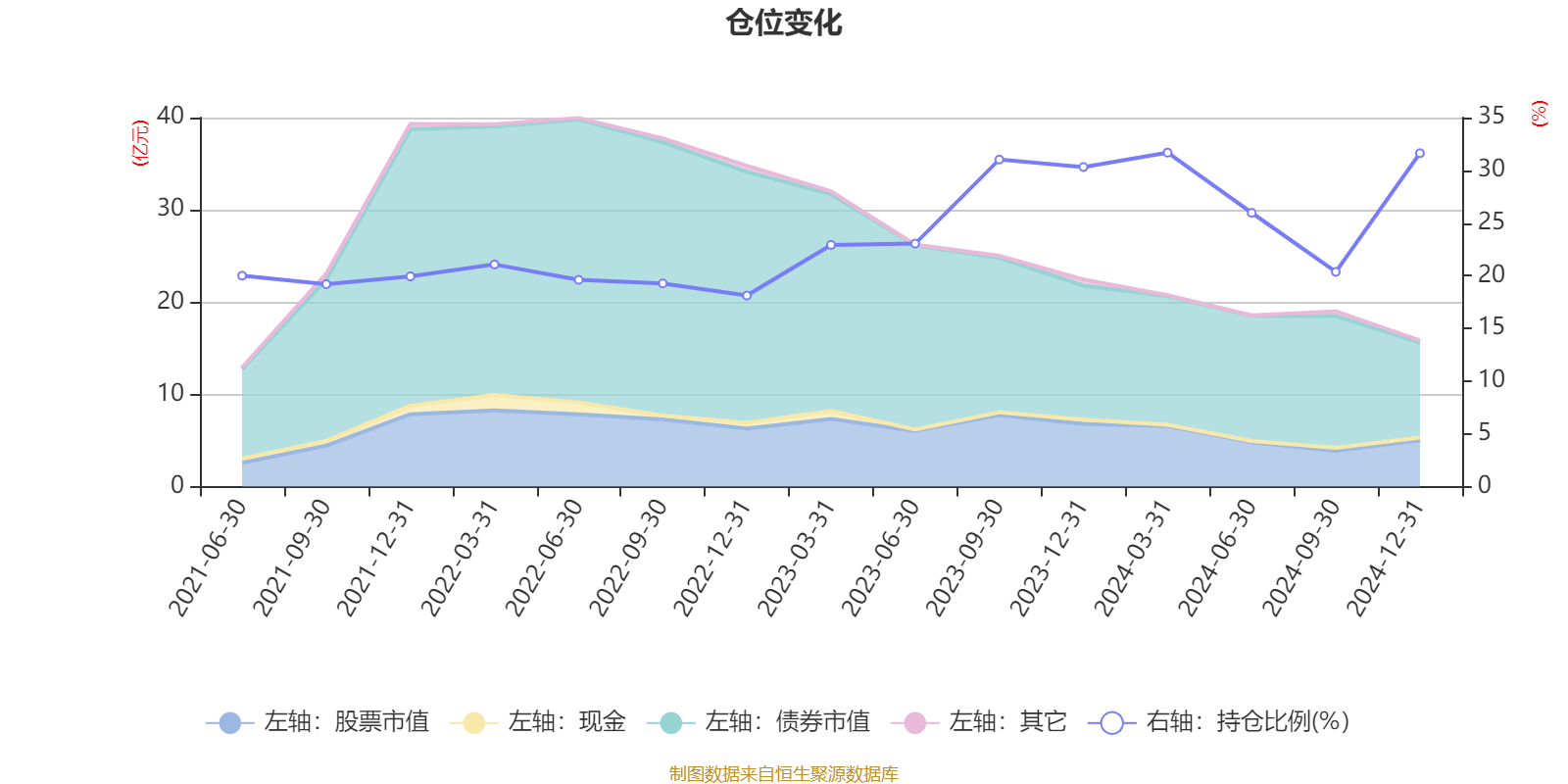 据定期报告数据统计,近三年平均股票仓位为24.58%,同类平均为18.74%。2024年一季度末基金达到31.68%的最高仓位,2022年末最低,为18.12%。