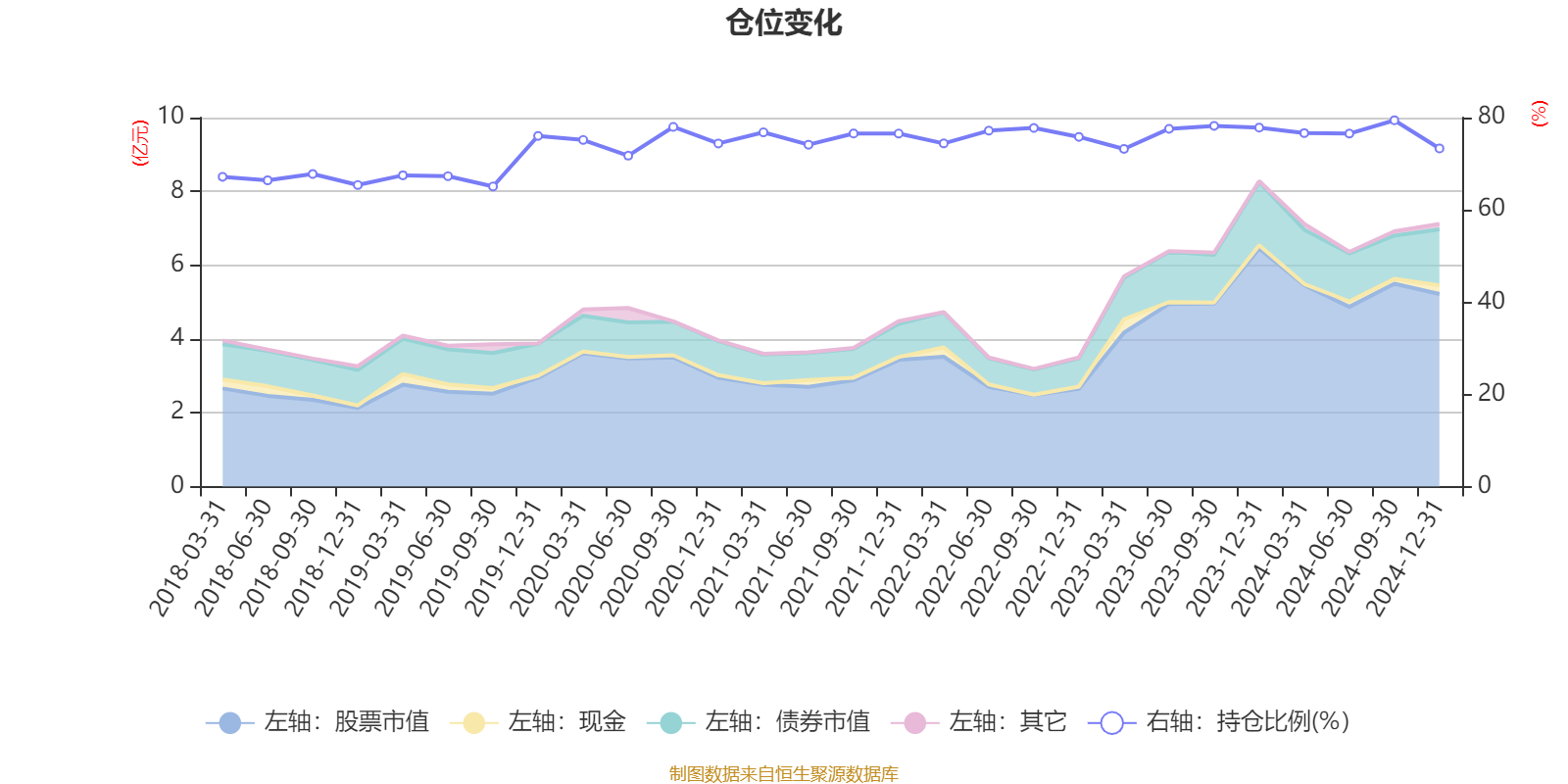 据定期报告数据统计,近三年平均股票仓位为76.49%,同类平均为84.66%。2024年三季度末基金达到79.42%的最高仓位,2019年三季度末最低,为65.07%。