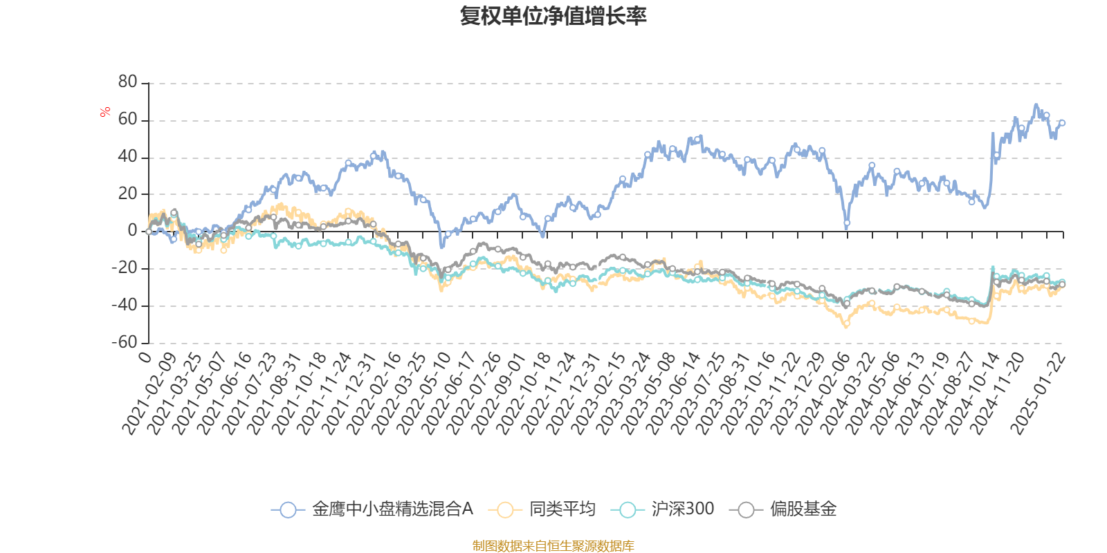 截至1月22日,金鹰中小盘精选混合A近三个月复权单位净值增长率为5.09%,位于同类可比基金71/202;近半年复权单位净值增长率为25.20%,位于同类可比基金67/202;近一年复权单位净值增长率为31.04%,位于同类可比基金103/191;近三年复权单位净值增长率为14.40%,位于同类可比基金13/130。