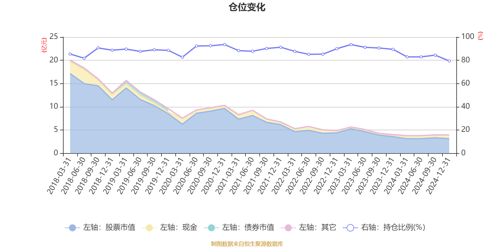 据定期报告数据统计,近三年平均股票仓位为86.88%,同类平均为84.97%。2020年末基金达到93.55%的最高仓位,2024年末最低,为79.43%。