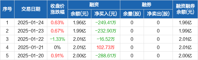 融资方面,当日融资买入907.01万元,融资偿还1156.42万元,融资净偿还249.41万元,连续3日净偿还累计498.83万元。融券方面,融券卖出0股,融券偿还0股,融券余量0股,融券余额0元。融资融券余额合计1.96亿元。
