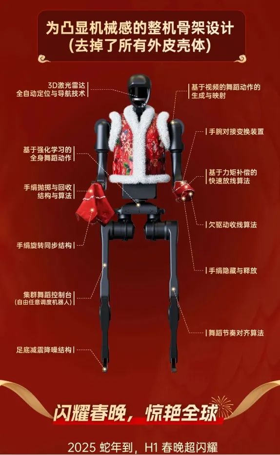 据悉,此次表演的机器人是宇树H1“福兮”,谐音“伏羲”。H1破壳在2023年,首次登上时代舞台;在北京世界机器人大会露脸;成长在2024年,亮相在英伟达GTC大会;还参演了张艺谋导演的《澳门2049》长期驻场舞台剧;依据舞蹈要求设计动作,靠AI训练来执行;16台H1激光SLAM定位,全自动走位变队形;快速转、抛手绢结构复杂,还需紧凑且可靠。