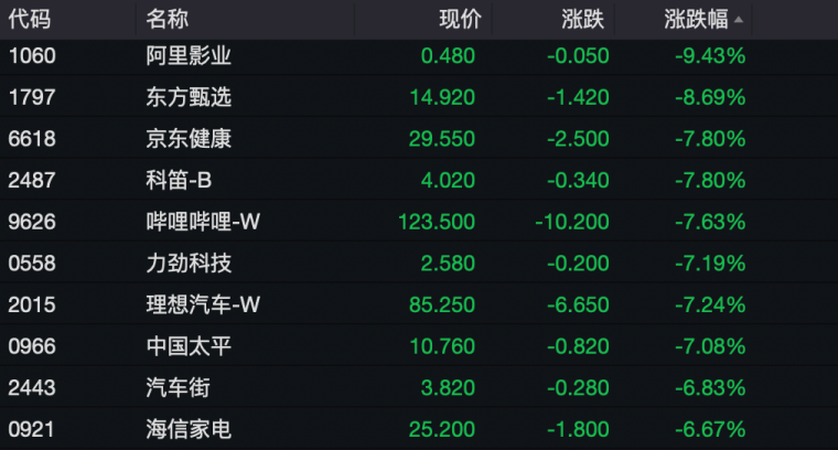 港股个股方面,不少知名个股股价也都出现较大跌幅。阿里影业跌近10%,东方甄选跌超8%,京东健康、哔哩哔哩、理想汽车等跌超7%。