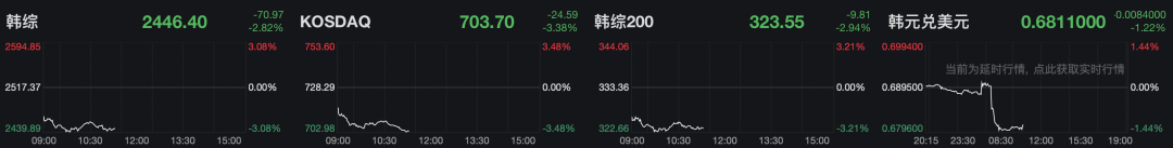 韩国综合指数跌2.82%,KOSDAQ指数跌3.38%。