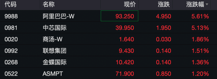 不过,阿里巴巴、中芯国际逆势上扬,截至发稿,均涨超5%。此外,商汤、联想集团等涨超1%。
