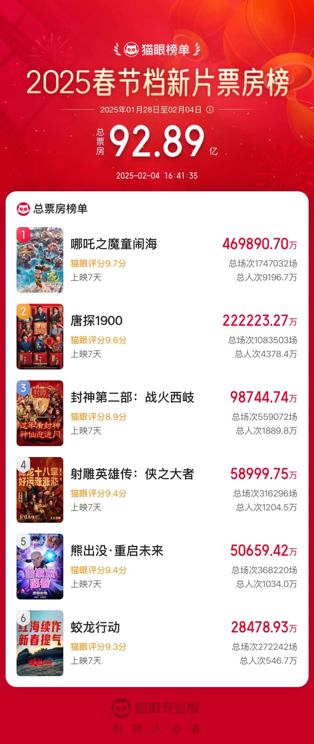 猫眼专业版显示,截至发稿,2025年春节档上映新片总票房(含点映及预售)已突破92亿。《哪吒之魔童闹海》《唐探1900》《封神第二部:战火西岐》分列春节档票房榜前三位。此外,2025年中国电影市场累计票房超北美票房成绩,位列全球第一。