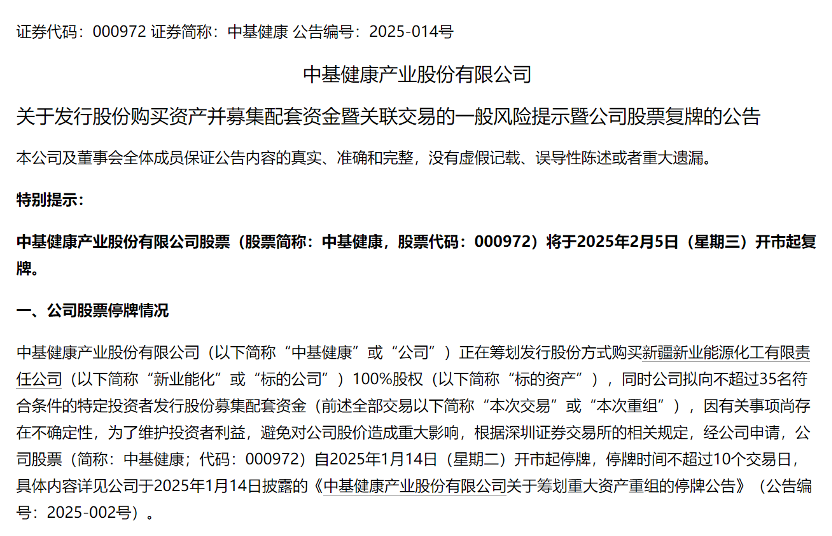 昨日晚间,中基健康发布公告称,公司正在筹划发行股份方式购买新疆新业能源化工有限责任公司(以下简称“新业能化”)100%股权,同时公司拟向不超过35名符合条件的特定投资者发行股份募集配套资金。